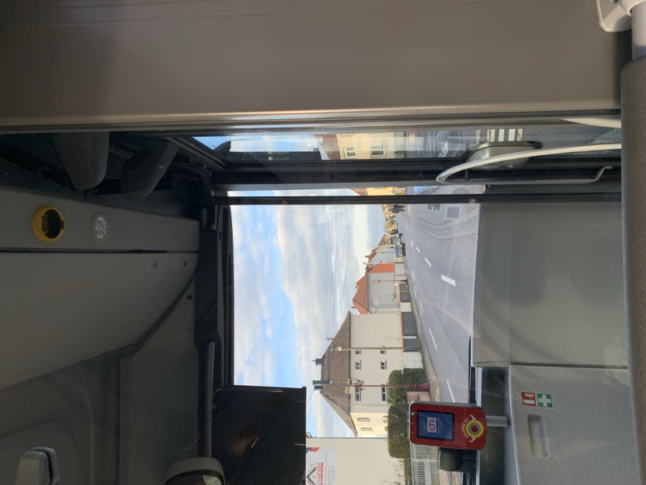 - "The image depicts the interior of a vehicle, likely a bus, looking forward and slightly to the right onto a street scene in Holtzheim, France" by FM-iiCMa2, licensed under CC BY 4.0