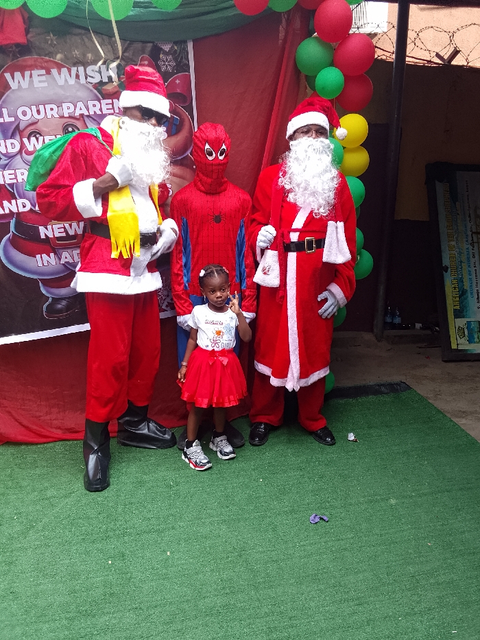 An outdoor scene in Agani Holy Spirit Church, Obeke, Rivers State, Nigeria, depicts four individuals posing on green artificial turf. On the far left, an adult male in a full red and white Santa Claus costume, complete with hat, white beard, white gloves, black sunglasses, and black boots, holds a green sack over his left shoulder and a yellow scarf draped over his right shoulder. Directly behind a young female child stands an adult male in a full red and blue Spiderman costume with a masked head. On the far right, another adult male in a full red and white Santa Claus costume, including hat, white beard, white gloves, and black shoes, holds a small white bag with red accents in his left hand. The young female child, with dark braided hair, stands centrally in front of the Spiderman figure, wearing a white t-shirt, a red tutu skirt, and gray sneakers with red accents, her right hand partially raised. The background features a large Christmas banner depicting Santa and text partially visible as "WE WISH ALL OUR PARENTS...", draped red and green fabric, and an arch of red, green, and yellow balloons. To the far right, a dark sign is partially visible, stating "AFRICAN CHURCH OF THE HOLY SPIRIT, AGANI HOLY SPIRIT CHURCH, OBEKE, RIVERS STATE, NIGERIA". A small crumpled purple object lies on the green artificial turf near the center-right.