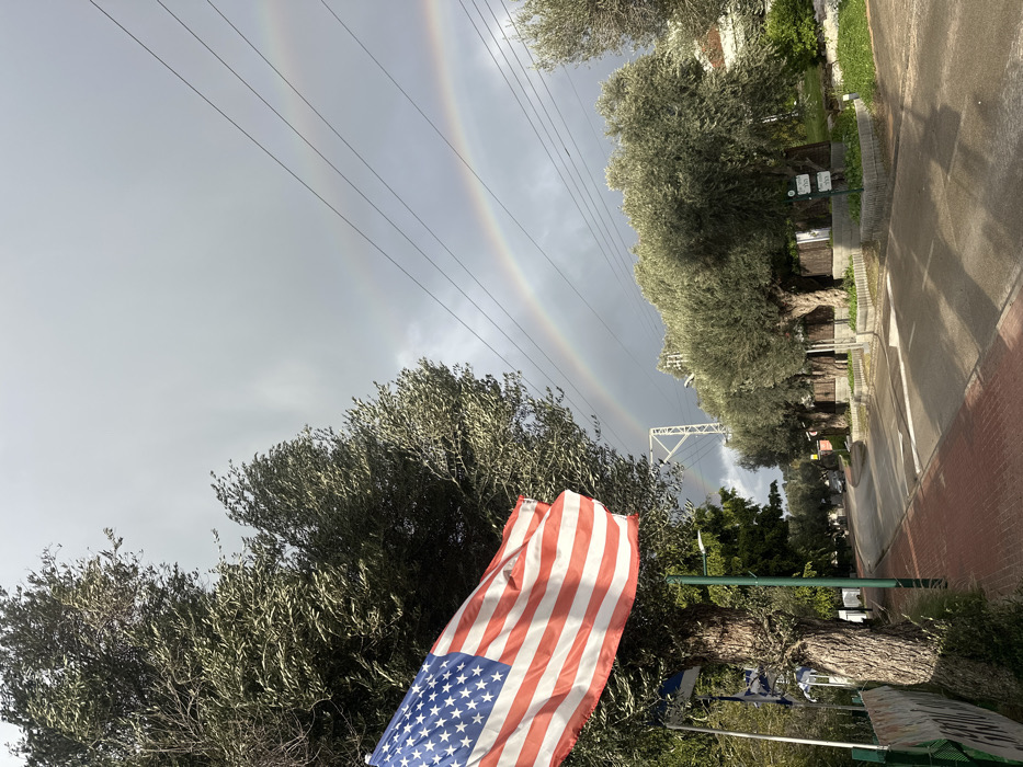 The image captures a street scene in Beit Yitshak Sha'ar Hefer, Israel, under a cloudy sky with visible atmospheric phenomena. In the foreground, a large American flag, displaying red and white stripes and a blue canton with white stars, is unfurled from a flagpole on the left side, partially obscured by the dense, silvery-green foliage of a mature olive tree. Below the American flag, several smaller Israeli flags are visible on a lower pole or fence. The street, paved with asphalt, recedes into the distance, bordered by a reddish-brown brick sidewalk on the left and a row of large, gnarled olive trees planted in raised stone planters on the right. Utility poles and overhead power lines traverse the sky above the street. In the mid-ground and background, a distinct double rainbow arches across the grey sky, with the primary bow clearly defined and a fainter secondary bow visible above it. No individuals are present in the scene.