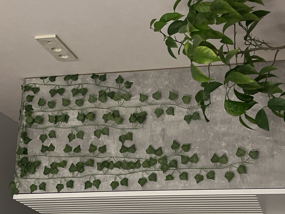 An interior scene is depicted in what is identified as Семибратово, Russia. The image focuses on a vertical panel or furniture piece on the left, which features a section of light gray, textured surface adorned with multiple strands of artificial green ivy vines hanging vertically. To the immediate left of this textured section, a white vertical slat design is visible. On the adjacent, plain light gray wall to the right, a white electrical outlet with three receptacles is mounted. In the lower right foreground, a portion of a live green plant with numerous bright green leaves and slender, thorny branches is visible, suggesting a potted plant. No individuals are present, and no actions or interactions are occurring.