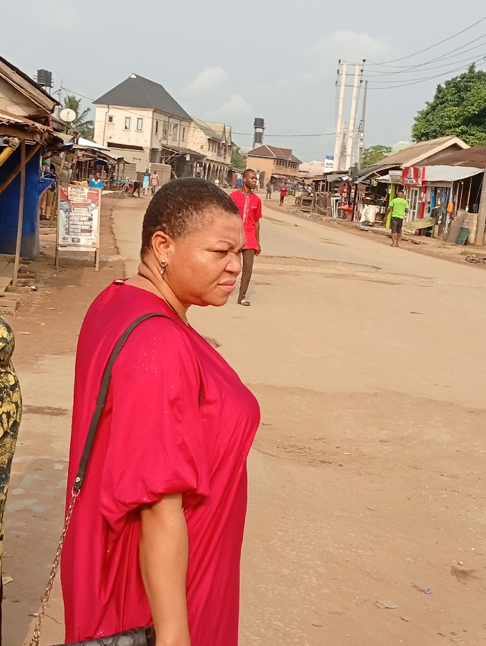 The image depicts a street scene in Umuode, Nigeria, under an overcast or hazy sky. The foreground features a middle-aged woman positioned on the left, facing right and slightly away from the camera. She has short, dark hair and wears a long, loose-fitting bright red dress with puffed sleeves. A dark shoulder bag with a gold chain strap is visible on her left shoulder, and a single earring adorns her left ear. Her expression is neutral to slightly pensive, with her gaze directed towards the right. Part of another person, wearing patterned clothing, is visible on the far left edge of the frame. The central feature is a wide, unpaved dirt road, exhibiting visible ruts and minor irregularities. Several individuals are present on the road and sidewalks. A young man in a red collared shirt and dark trousers walks from left to right in the midground, looking forward. Further down on the right side of the road, another man in a bright green t-shirt and dark shorts walks towards the left. The environment consists of commercial structures lining both sides of the street. On the left, a series of market stalls and single-story buildings with corrugated metal roofs are visible, along with a prominent sign advertising "POS ATTENDANT REQUIRED." Behind these, a more substantial two-story white building with a dark gabled roof and rectangular windows stands out, topped with a water tank. The right side of the street also features various stalls and shops. In the background, a large white structure with lattice-like supports, possibly a transmission tower or water tower, is visible. Overhead electrical wires crisscross the scene, and green foliage is visible on the far right.