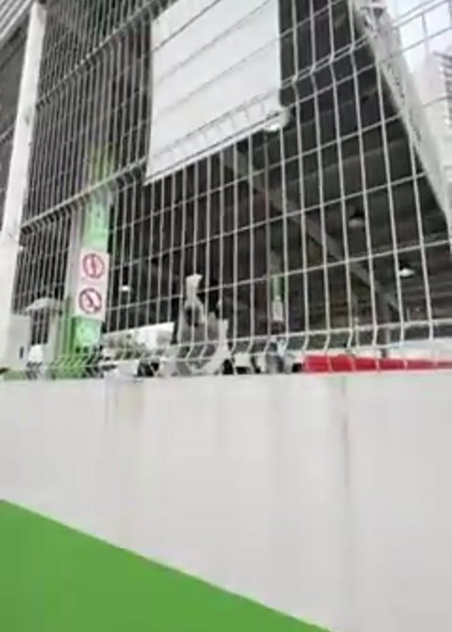 white and black dog in a cage barking. The cage has a green and white border. Behind the cage, there are buildings. The video is shot from a low angle, looking up at the cage.