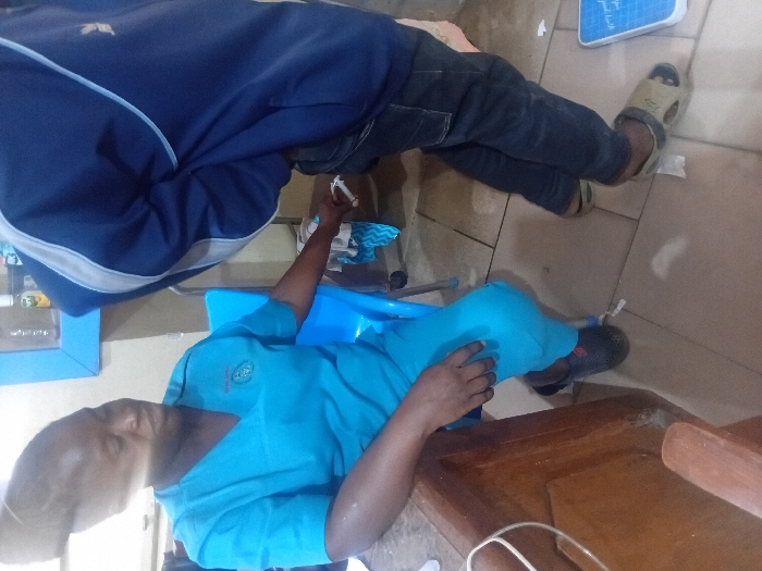 A person in blue scrubs sits, holding a syringe, with a person in a blue jacket leaning over them. The person receiving the injection wears black pants and sandals. A blue plastic chair is underneath the person giving the injection. A scale rests on the floor. A wood-like surface with a white wire lies to the right. A blue-framed object is partially visible in the background. The floor has a tile pattern.