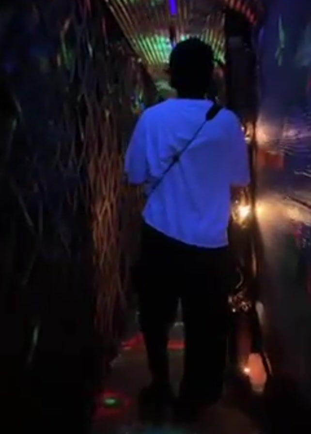 A person wearing a white t-shirt and black pants walks through a dimly lit, narrow hallway. The hallway is decorated with strings of lights, geometric patterns on the walls, and colored lights projected on the floor and ceiling. The person has a bag slung across their body and is walking away from the camera.