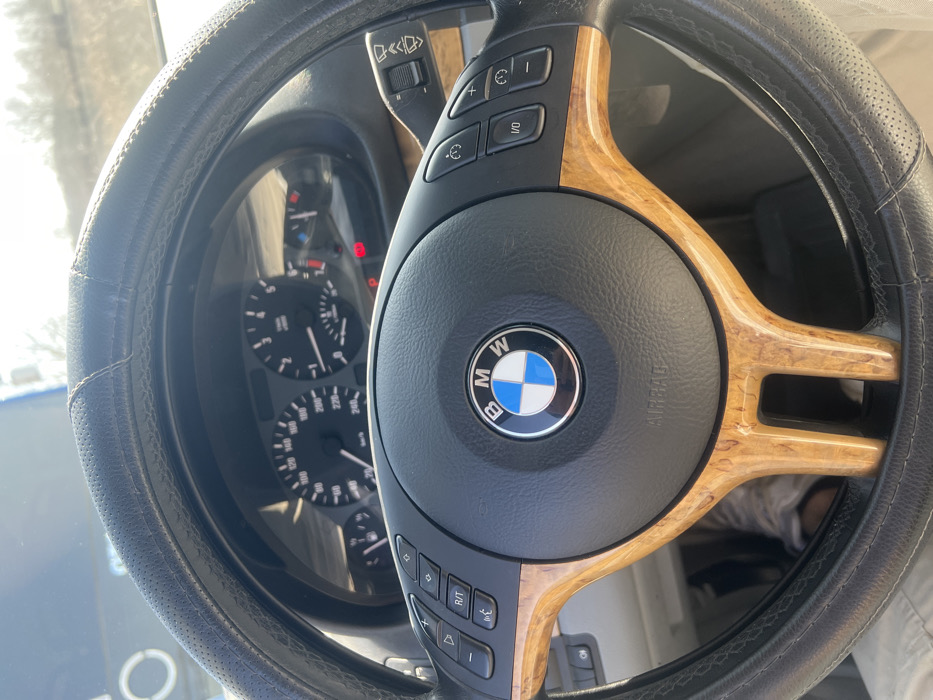 The image depicts the interior of a vehicle from the driver's perspective, focusing primarily on the steering wheel and the instrument cluster. The steering wheel is a black, multi-function BMW unit, featuring a prominent BMW logo in the center and the word "AIRBAG" inscribed below it. The lower spokes of the steering wheel are adorned with a polished light brown wood grain trim. The outer rim of the steering wheel is covered by a worn, black perforated leather cover, showing visible stitching and some deterioration. The left side of the steering wheel hub contains black buttons for media control, including volume adjustment, and a "R/T" button. The right side features black buttons for cruise control, including "I/O" and plus/minus controls. Behind the steering wheel, the instrument cluster is visible, illuminated by daylight. It includes at least two primary analog gauges: a speedometer, calibrated up to 240 or 260 km/h, and a tachometer, calibrated up to 7000 RPM. A fuel gauge is situated on the lower left of the cluster, while several warning lights, including a prominent red indicator, are active on the lower right. Through the windshield, a bright, sunlit outdoor environment is visible, suggesting clear weather conditions. Reflections are present on the glass. On the left side of the external view, a blue object with a white circular element is partially discernible, possibly a sign or part of a structure. On the right side, sparse, barren vegetation against a bright sky suggests an open, possibly rural or roadside landscape. A portion of a person's leg, clad in light-colored trousers, is visible in the lower center-right foreground, beneath the steering wheel, indicating the presence of a driver. The specific location within the city of Montana, Bulgaria, cannot be determined from the visual evidence presented in the image.