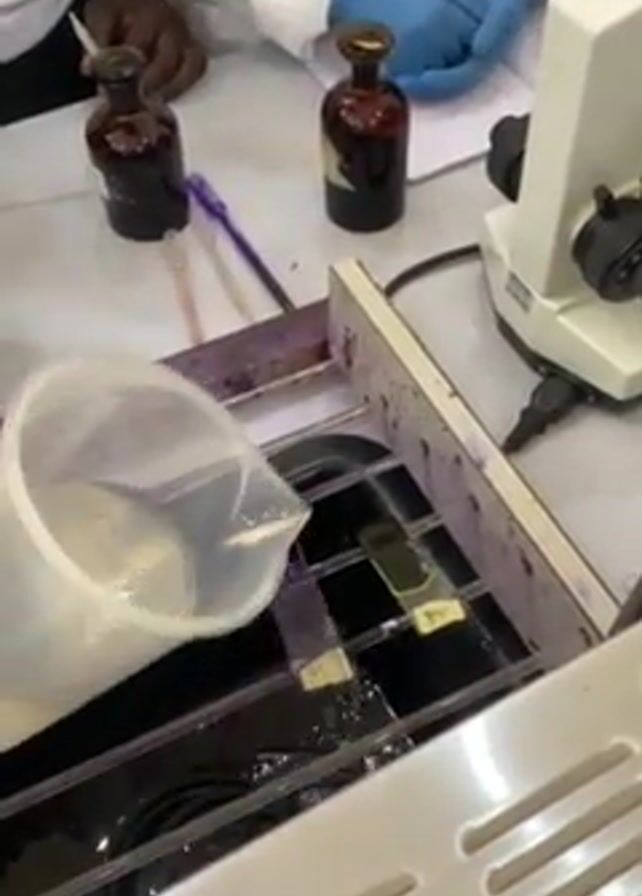 In a lab setting, a person wearing a lab coat pours a clear liquid from a plastic pitcher into a staining jar containing several microscope slides. Two dark-colored bottles and a microscope are on the table, and another person wearing gloves is also present. The staining apparatus has a purple-stained frame, suggesting the use of staining solutions.