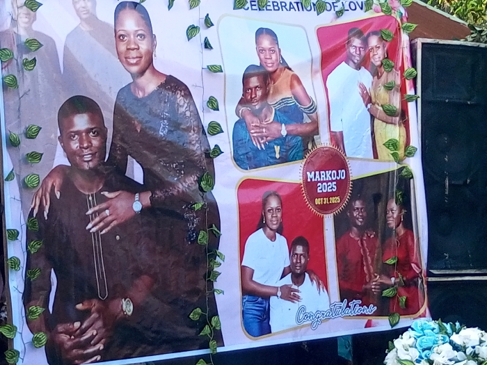 A large commemorative banner featuring an African couple is displayed outdoors in Amokvo, Nigeria