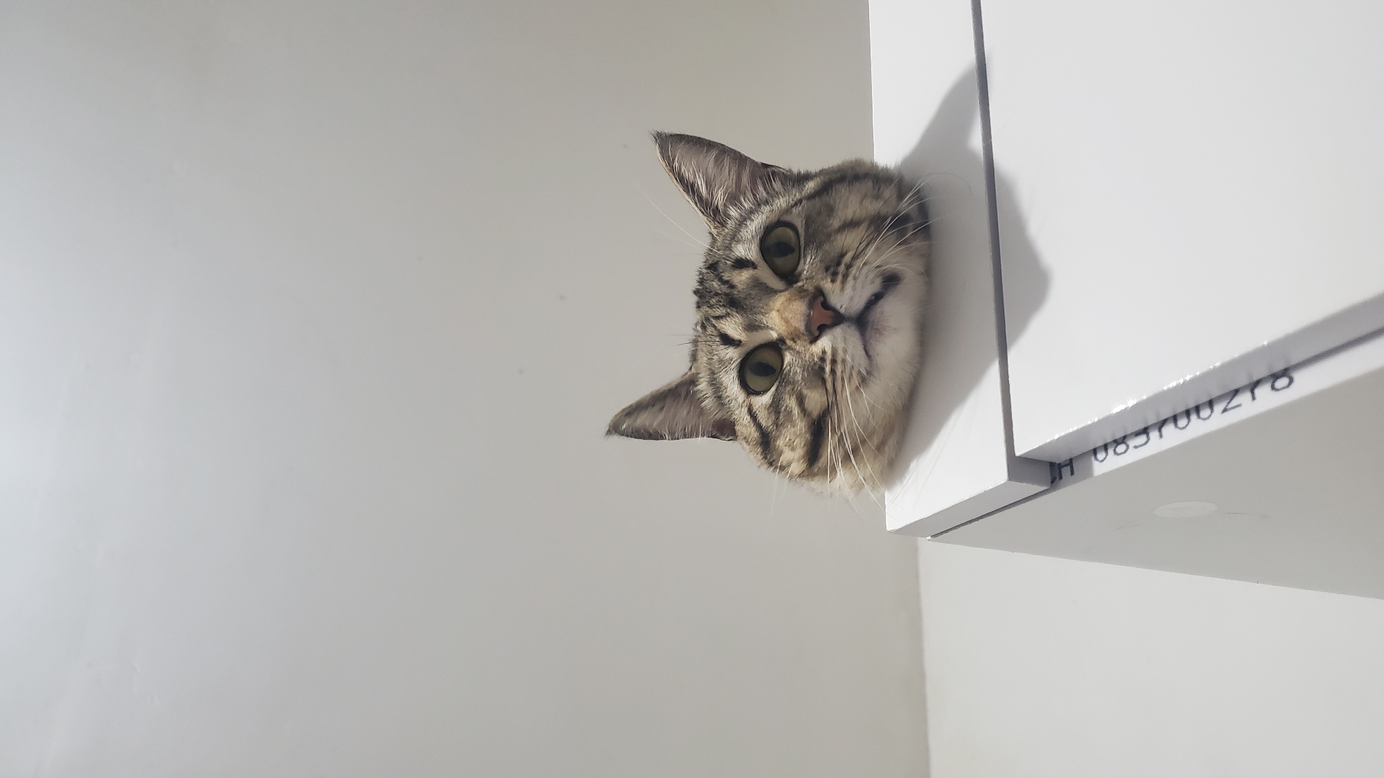 - "The image displays a close-up, low-angle view of a domestic tabby cat's head peering over the top edge of a white, two-tiered structure, located in Curitiba, Brazil" by FM-eoIKl2, licensed under CC BY 4.0