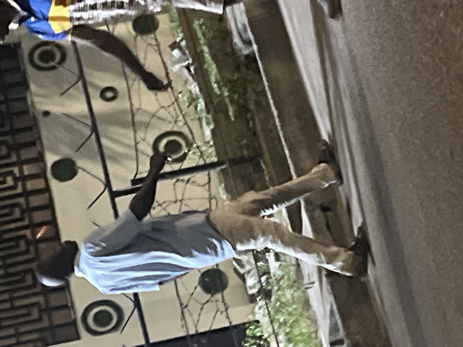 A dark-skinned person stands on a sidewalk, wearing a light blue shirt and tan pants. They appear to be interacting with a wrought-iron fence featuring circular designs. The fence is positioned between the person and a patch of greenery. Part of another person's leg, clad in blue and yellow, is visible at the top. The scene is captured with the camera oriented sideways, making the composition appear tilted.