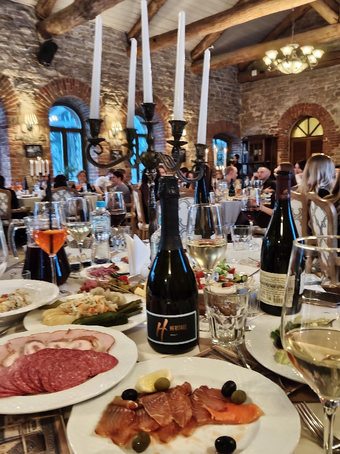 The image captures an indoor dining event, likely in a restaurant or banquet hall in Скорняково, Russia. In the foreground, a white-covered table is set with various appetizers and beverages. Plates display items such as cured salmon slices garnished with green and black olives and a lemon wedge, a platter of sliced cured meats including salami and ham, and a dish containing pickled vegetables. Beverages include a dark green bottle of "HERITAGE BRUT" sparkling wine, a dark bottle of red wine, stemmed glasses containing white wine, and an orange-hued cocktail. A prominent antique-style five-arm candelabra with unlit white taper candles serves as a centerpiece. The background reveals a large room featuring exposed brick walls, arched windows admitting a blue ambient light, and a ceiling with visible wooden beams. Overhead, a multi-light chandelier and wall sconces provide additional illumination. Multiple individuals are seated at various tables throughout the room, indistinctly visible and engaged in dining and social interaction.