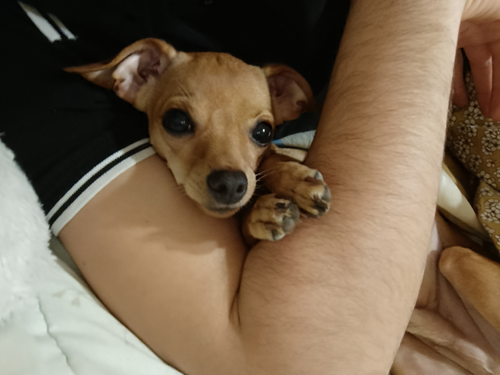 A tan Chihuahua rests on a person's arm, gazing directly at the camera. The person's arm is hairy, and they wear a black shirt with white stripes on the sleeve. The background includes a white bed sheet and part of a patterned pillow. The location is not discernible from the image.