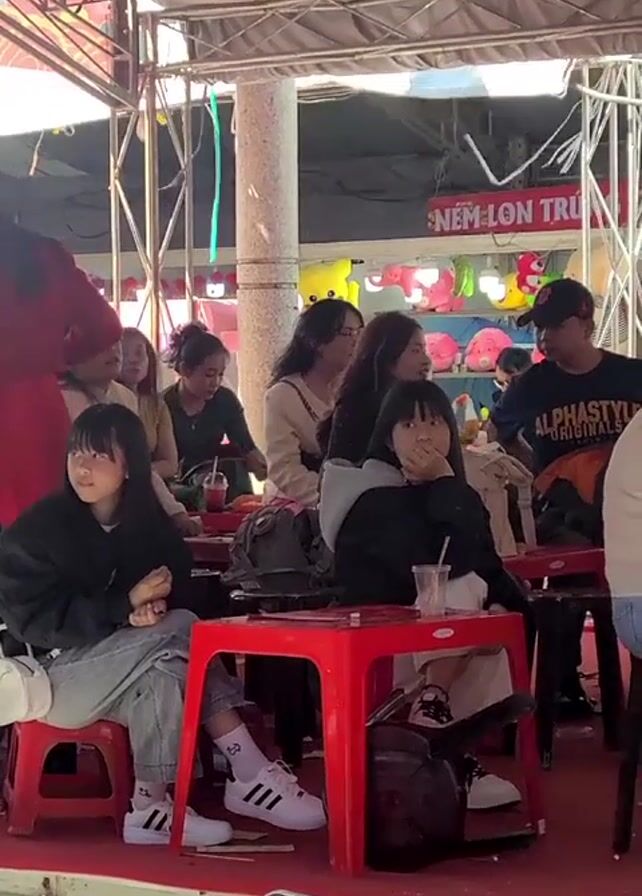 The video depicts a group of people, mostly young women, seated at small red tables, under a metal-framed tent-like structure