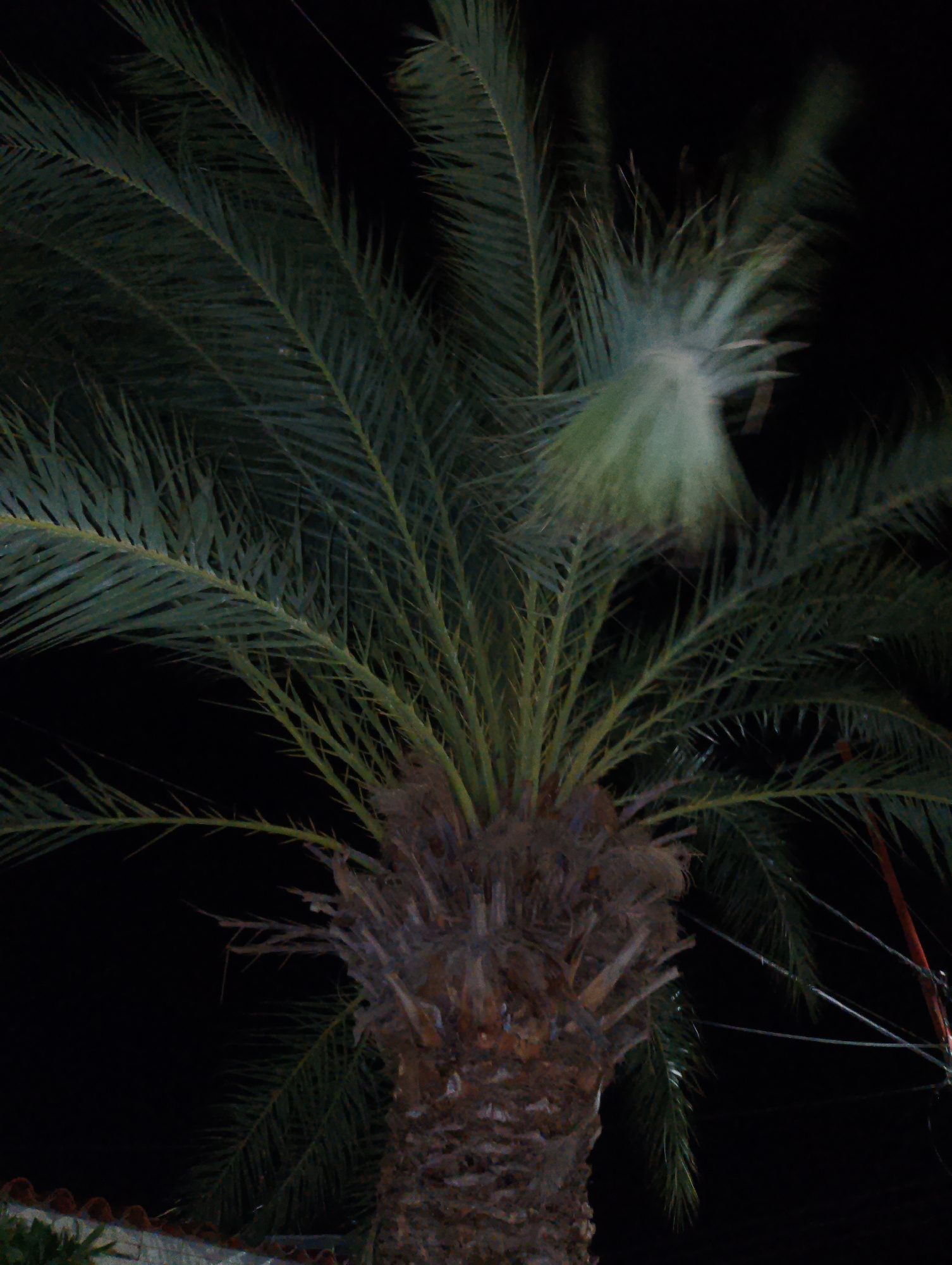 palm tree at night. The trunk of the tree is brown and textured, and the fronds are green and feathery. The background is dark, suggesting that the image was taken in low light conditions. There are some building materials on the lower left, with some light-colored cables to the right. The image does not show any people, actions or interactions. There is no information in the image that would identify it as El Espinal, Venezuela.