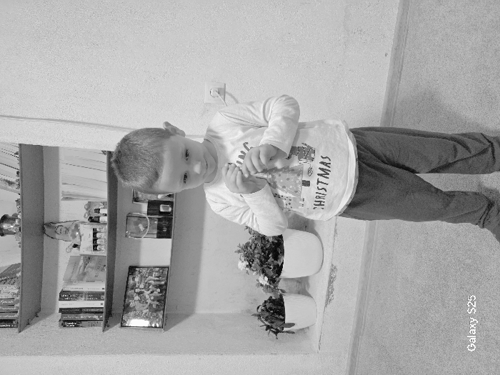 An indoor, black and white image depicts a male child standing in a room in Karnalovo, Bulgaria