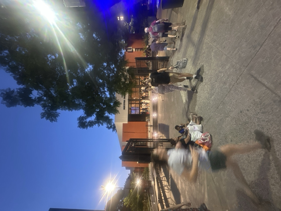 An outdoor evening scene shows people near a building with stairs leading to an entrance. Some individuals are sitting on the ground, while others are walking or standing in small groups. A tree and streetlights are visible, casting light and shadows. The sky is a deep blue, suggesting twilight. The image is tilted, adding a dynamic perspective to the scene.