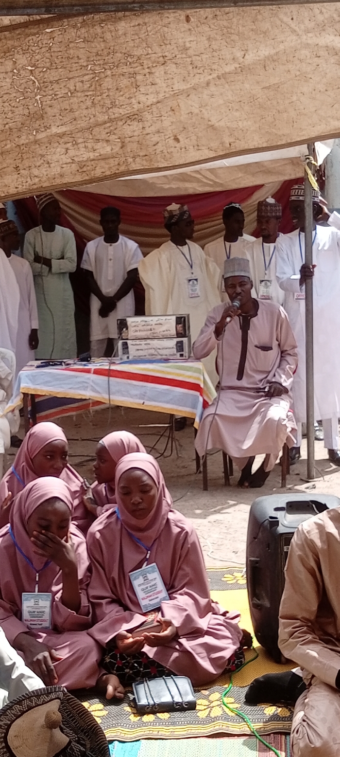 This image depicts an outdoor gathering in Dakata, Nigeria, occurring under a makeshift fabric canopy