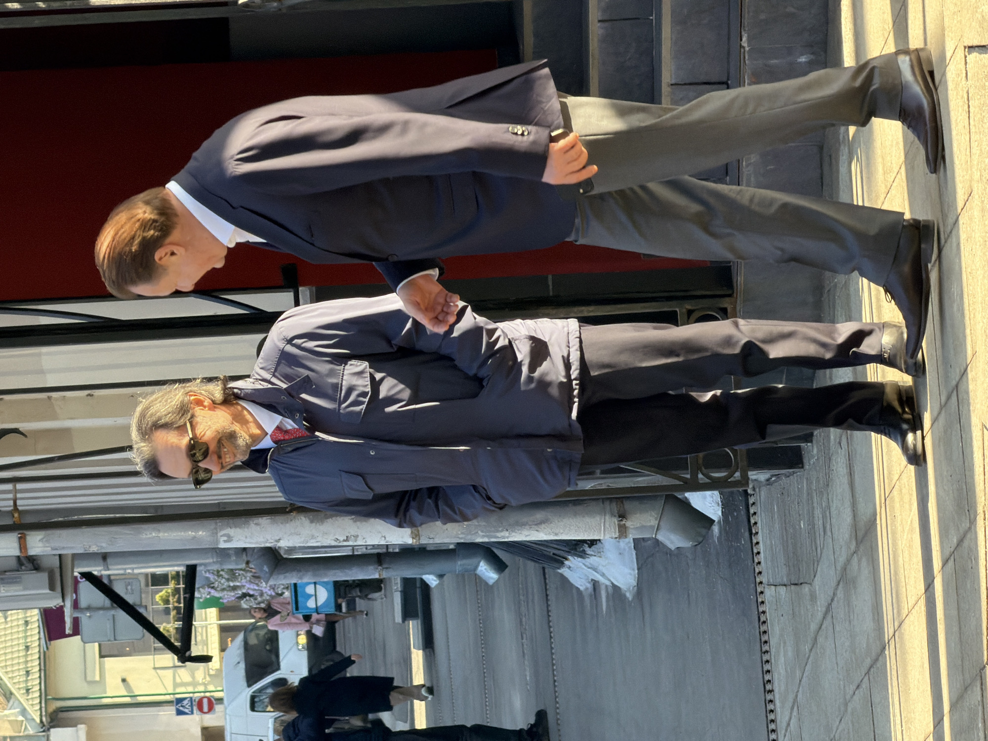 The image depicts two adult males interacting on a sunlit urban sidewalk. The man on the left, with medium-length greying hair, a beard, and dark sunglasses, is dressed in a dark blue, collared jacket over a white shirt and a red patterned tie, with dark trousers and black dress shoes. His hands are in his jacket pockets, and he smiles while looking towards the right. The man on the right, partially visible, has short, reddish-brown hair and is wearing a dark blue suit jacket over a white collared shirt, grey trousers, and dark brown dress shoes. His left hand is open and extended, palm up, in a gesturing motion towards the first man, and his mouth is slightly open as if speaking or reacting. The setting is an asphalt or concrete sidewalk next to a building with a dark red entrance or facade behind the men. Several grey metal drainpipes run vertically along the building's side, with white remnants of snow or ice at their bases. Strong shadows are cast on the sidewalk by the bright sunlight. In the background, across a narrow street, other pedestrians are visible, including a woman in a pink coat and a person in a dark coat. A white delivery van is parked or moving on the street. A blue "Yandex.Lavka" delivery box is positioned on the sidewalk in the mid-ground, to the left of the woman in pink. Further in the background, a light-colored building with a distinctive green tiled roof and a road sign pole with pedestrian crossing and no-entry signs are visible. This scene is located on an urban street in Moscow, Russia, as evidenced by the presence of a Yandex.Lavka delivery box and the characteristic architecture.