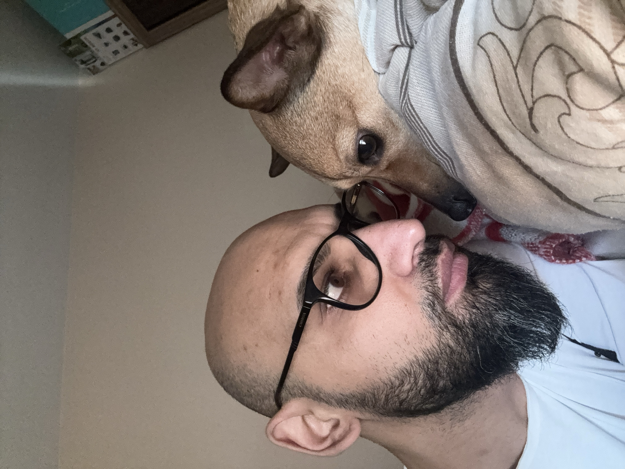 - "A close-up, slightly tilted shot shows a bald man wearing glasses with a dark beard, nuzzling with a fawn-colored dog" by FM-LLKcV2, licensed under CC BY 4.0
