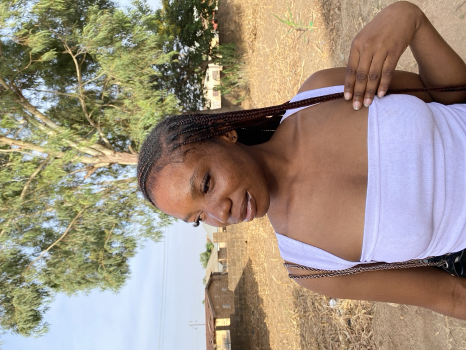 The image depicts a female subject outdoors in Kuru Dungus, Nigeria. The subject, centrally framed, has dark skin and long, dark braided hair with reddish strands and laid baby hairs. She wears a white, ribbed sleeveless top with a squared neckline. A dark strap, possibly from a bag, crosses her left shoulder. Her right hand lightly touches the strap of her top near her right shoulder. She is observed looking towards the right side of the frame with a neutral expression, featuring visible eyelashes and glossy lips. The background consists of dry, earthy ground with sparse, light-colored vegetation. To the left, several low-rise structures constructed from what appear to be concrete blocks or mud bricks are visible. A large tree with a light-colored trunk and green foliage is prominent in the upper background. The sky is clear blue, indicating daylight conditions.