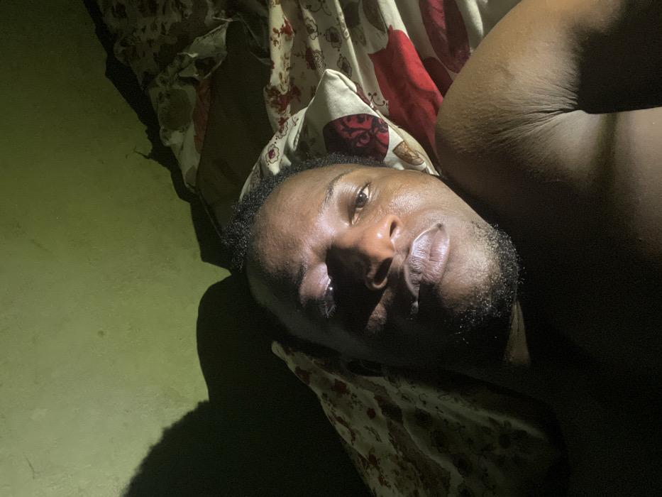 A dark-skinned man lies on a pillow with a floral pattern. His head is tilted, eyes mostly closed, with a stubble beard visible. A strong light source illuminates one side of his face, creating deep shadows. The background includes what appears to be a patterned sheet or fabric and a blurry wall or floor. The composition emphasizes the man's face and upper torso.