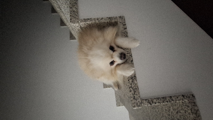 A cream-colored Pomeranian dog sits perched on speckled granite stairs, looking up at the camera. The stairs are set against a light grey wall, creating a minimalist backdrop. The dog's fluffy fur and small, dark eyes are the focal point, while the perspective tilts, offering a unique angle of the scene. A small portion of a dark colored area is present in the upper right corner.