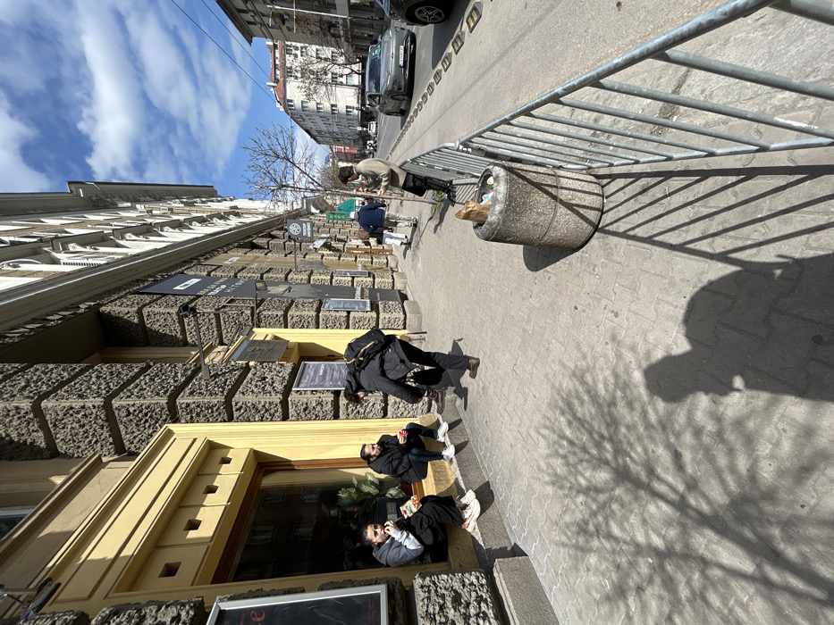 This image depicts a sunlit urban street scene in Sofia, Bulgaria, specifically at or near **ulitsa "Georgi S. Rakovski" 108, 1000 Sofia Center**. The scene is captured on a clear day with a blue sky and scattered white clouds. Strong shadows, including those of a leafless tree and an individual, are cast across the grey block-paved sidewalk. On the left, a multi-story building with a distinctive rough-textured stone facade and yellow-framed ground-floor windows dominates the foreground. Two individuals are seated on the raised concrete threshold of one of these yellow-framed shop entrances. The person on the left, a female, wears a dark hooded jacket and light pants, and is seen eating from a small package. The person on the right, a male, wears a dark hooded jacket and dark pants, and holds a red cup. Immediately in front of them, on the sidewalk, a third individual, presumed male, with a dark backpack, is bent over, appearing to adjust or tie footwear. This individual wears a dark jacket, dark pants, and brown shoes. Further to the right, adjacent to a silver metal barrier fence that separates the sidewalk from the street, a fourth individual, presumed male, wearing a light-colored sweater and dark pants, stands facing the street. A cylindrical concrete trash receptacle, containing a brown paper bag and other refuse, is positioned between this individual and the fence. In the mid-ground, several other pedestrians are walking along the sidewalk away from the camera. The street beyond the fence shows vehicular traffic, including a silver Hyundai Ioniq 5 electric vehicle with a Bulgarian license plate (Sofia prefix "CA"). Overhead wires, indicative of a tram or trolleybus system, are visible above the street. Buildings with varied architecture, including multi-story residential blocks and a larger institutional-style building, extend into the background under the blue sky.
