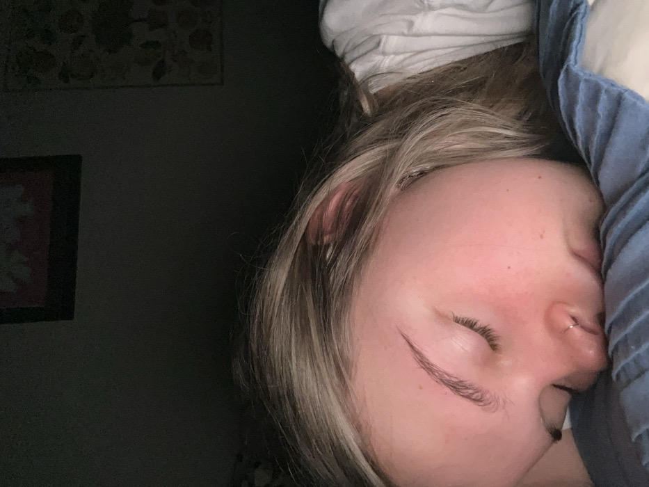 A close-up image shows a person sleeping in a dark room. The individual has fair skin, blonde hair with darker roots, and closed eyes with visible eyelashes. A small nose ring is present. The person's face is pressed against a blue fabric, possibly a blanket or pillow. In the background, a partially visible, framed picture hangs on a dark wall, and a floral patterned object is also visible. The overall lighting is dim.