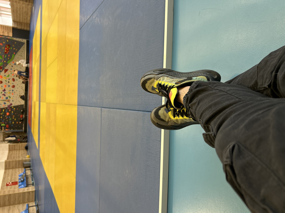The image depicts an indoor sports facility in Sliven, Bulgaria, captured from a first-person, seated perspective. In the foreground, the observer's lower legs and feet are visible, clad in dark cargo pants and grey, yellow, and translucent green athletic shoes, with ankles crossed. These rest on a light blue mat or floor surface, separated by a white horizontal divider from the main floor area. The midground and background are dominated by extensive interlocking martial arts mats laid out in alternating blue and yellow sections. Beyond these mats, a large climbing wall is present, dark grey and densely covered with multi-colored climbing holds. Several individuals are visible near the climbing wall: one person in a white gi stands on the mats, while others, including children, are seated or standing at the base of the climbing wall, appearing to observe or engage in activities. Along the left wall, wooden paneling is visible, against which are positioned several blue chairs, a red fire extinguisher, and a silver trash bin. The facility is illuminated, with plain light-colored walls above the paneling.