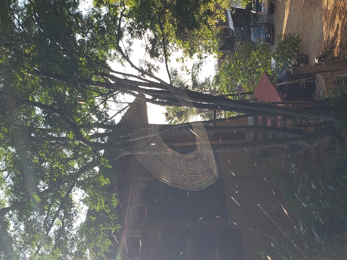 The image displays an outdoor scene in an unspecified area of Unknown, Mexico, characterized by abundant vegetation and residential structures under strong sunlight. A large, leafy green tree dominates the left and upper central portions of the frame. A distinct, semi-circular spiderweb is prominently featured in the upper-left to mid-left quadrant, illuminated by direct sunlight, creating a pattern of bright, concentric lines. Numerous bright, linear streaks and scattered points of light, consistent with sun glare or illuminated particles, are visible across the lower-left and central areas. Behind the foreground tree, a multi-level building constructed from dark materials, possibly wood or stone, is partially visible and mostly cast in shadow. An exterior wooden staircase with railings ascends the side of this building. Below the staircase, a reddish-brown sloped roof is present, near which a black cylindrical water storage tank with a white lid is situated. The midground and background include additional dense green foliage, consistent with tropical or subtropical plant life, including palm trees. A dirt road extends from the right mid-ground into the background, where at least two dark-colored sport utility vehicles are parked. Further structures and dense vegetation are discernible in the distant background under a bright sky. No individuals are visible within the frame.