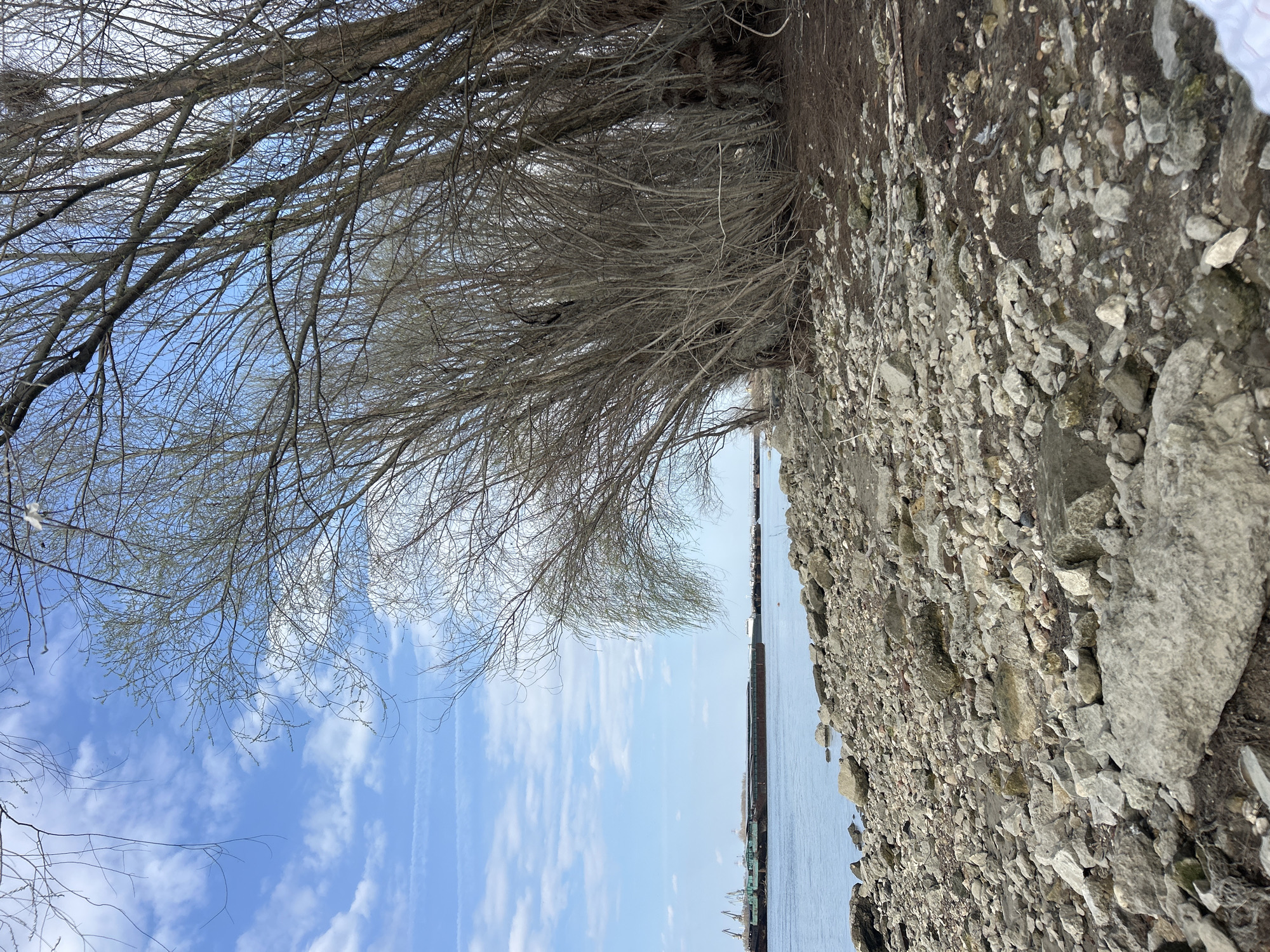The image depicts a riparian landscape along the Danube River in Ruse, Bulgaria, likely during late winter or early spring. The sky, occupying the upper portion, is light blue with scattered white cumulus clouds and two distinct aircraft contrails. The right half of the frame is dominated by a dense stand of deciduous trees, characterized by numerous bare, thin, brown branches; some branches exhibit nascent pale green buds. The immediate foreground and mid-ground feature an uneven, rocky shoreline composed of various sizes of grey and off-white stones, interspersed with dark soil and scattered brown organic debris. The river, a calm, dull blue-grey, flows across the left and central mid-ground. On the distant bank, across the river, a commercial port facility is visible. This includes several dark-hulled barges or cargo vessels moored, and behind them, multiple tall, green-painted industrial cranes. No individuals are present in the scene.