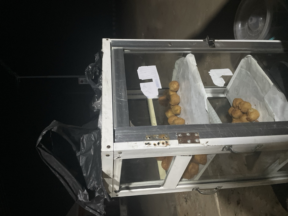 - "A glass display case with a metal frame contains two piles of fried, golden-brown balls separated by a white paper divider" by FM-M6Vor1, licensed under CC BY 4.0