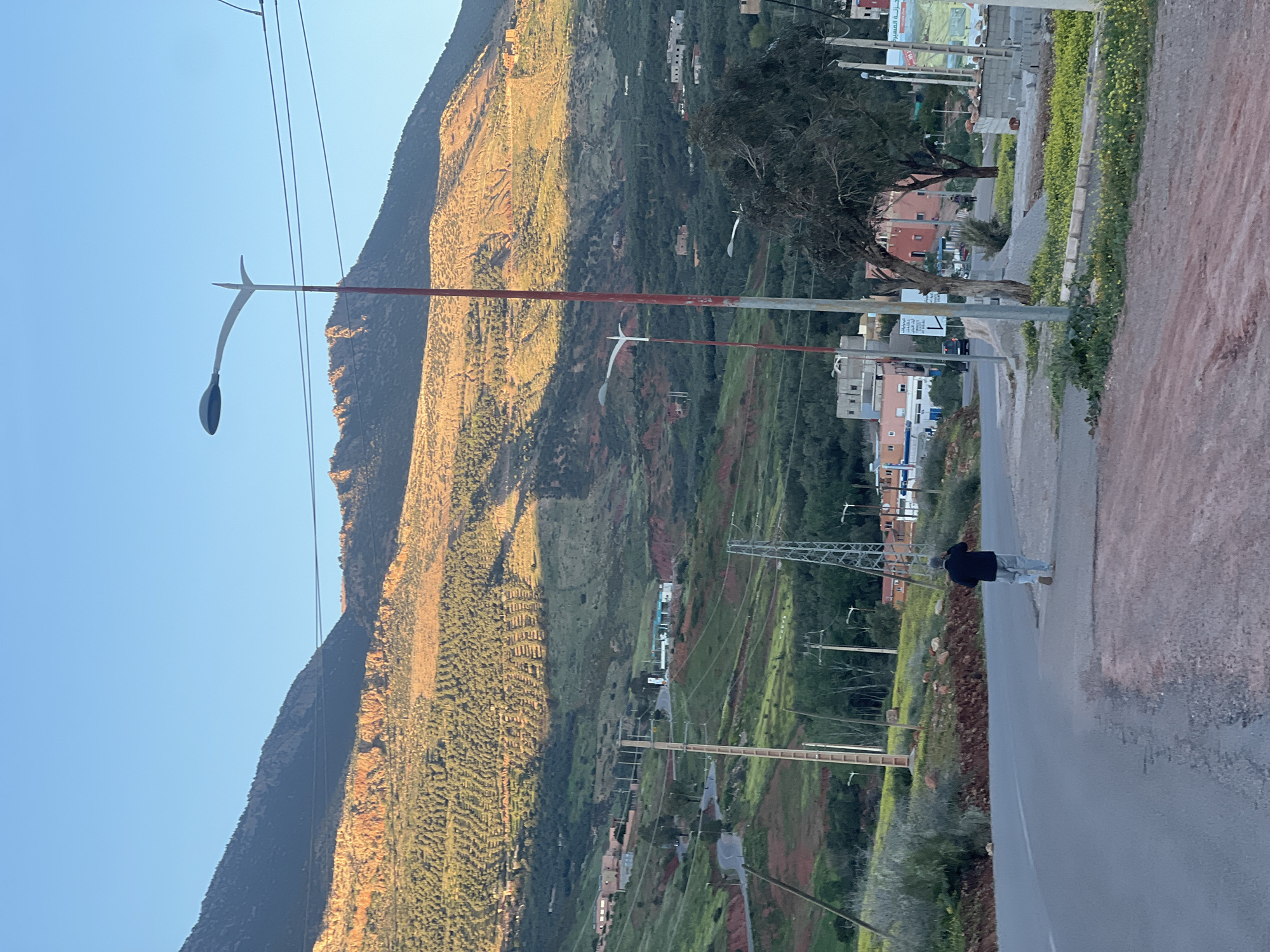 The image captures a scene in Ouaouizert, Morocco, focusing on a mountainous landscape meeting a roadside. A mountain dominates the left side, its surface textured with vegetation and areas illuminated by sunlight, contrasted by shadowy regions. In the foreground, a road stretches along the right side, and a person is seen walking along the edge of the road. Power lines and poles run alongside the mountain and road, indicating the presence of infrastructure. Streetlights are visible, adding to the developed nature of the area. Houses and buildings are dispersed along the slope of the mountain and alongside the road, suggesting a blend of rural and urban elements. The sky is clear and blue.