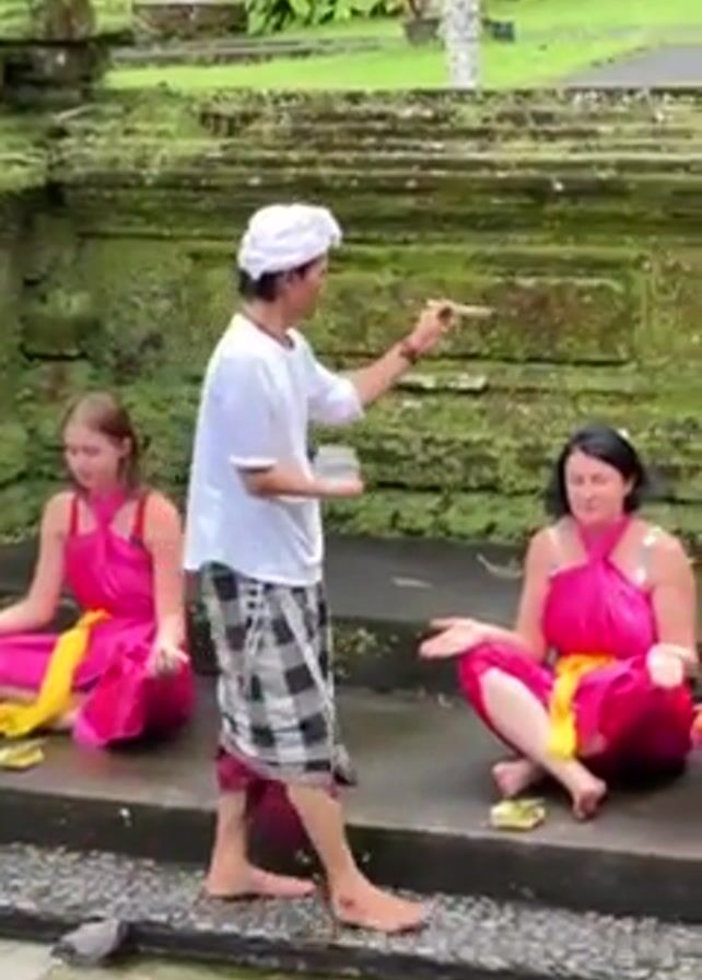 A man is performing a blessing ritual on three women in a traditional outdoor setting. The man, dressed in a white t-shirt, a checkered sarong, and a white headdress, walks barefoot along a stone ledge. He holds a small container in his hand and sprinkles liquid onto the head and face of each woman. The women, who are dressed in pink and yellow sarongs, are sitting cross-legged in a meditative pose on the stone ledge, with their hands resting in their laps. The ledge is covered in green moss and appears to be part of a tiered stone structure. A shallow pool of water runs along the base of the ledge, and lush green vegetation is visible in the background.