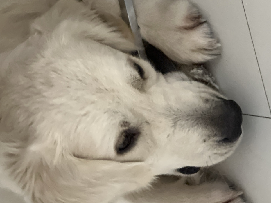 - "A cream-colored canine subject, possibly a Golden Retriever or similar breed, is depicted resting on a light-colored tiled floor with visible grout lines" by FM-mWrWX2, licensed under CC BY 4.0