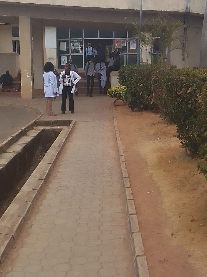 paved walkway leading away from the entrance of a building in Gwapan, Nigeria, located at latitude: 9.907, longitude: 8.96. The building appears to be a public building, possibly a school or hospital, based on the presence of several people wearing what appears to be medical scrubs. A group of five people are walking away from the building. Two women, one wearing a white lab coat and the other wearing a white coat over a brown T-shirt, are standing on the walkway looking at each other. There are bushes on either side of the walkway. The pavement has a pattern of hexagon-shaped blocks. The ground is dirt and dust. A man is sitting on the ground to the left of the walkway, and there is a small drain on the left side of the walkway.