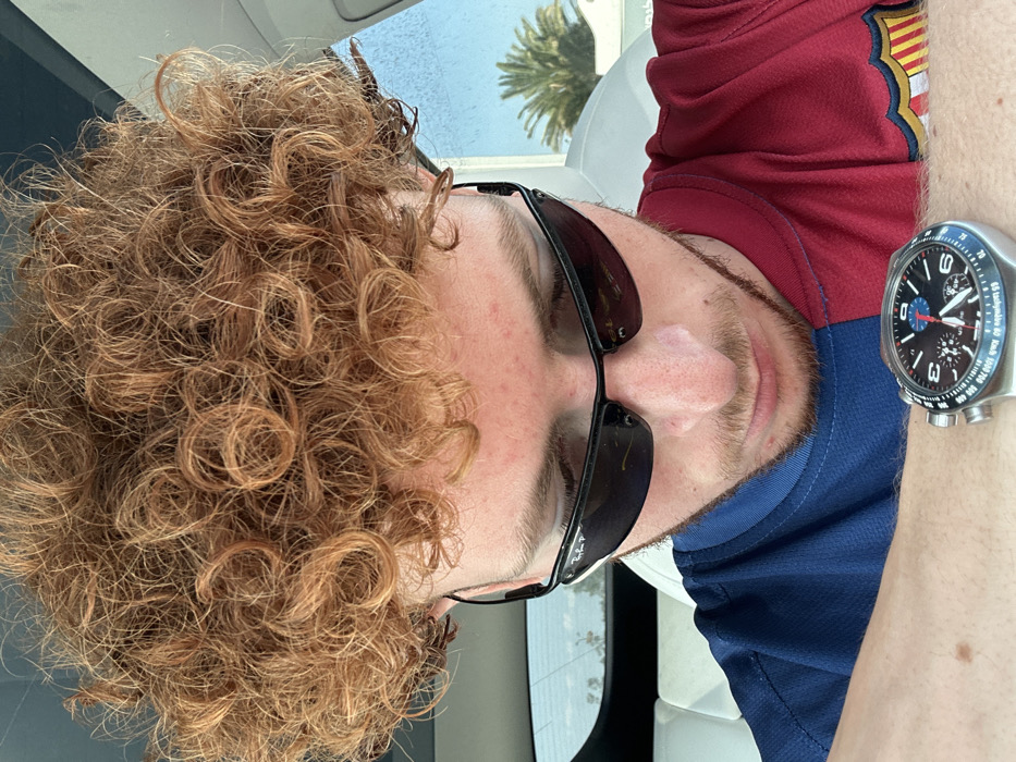 The image displays a male subject from an elevated perspective, positioned within a vehicle featuring a white interior. The subject has dense, reddish-brown curly hair and wears dark, frameless Ray-Ban P sunglasses. A short beard and stubble are visible on his face. He is clad in a t-shirt that is vertically split, presenting blue on the left side and red on the right, with a partial FC Barcelona crest visible on the red section. His left forearm, bearing a small, dark mole, is prominent in the foreground. A silver-toned wristwatch with a black chronograph dial, white numerals, and a red hand is secured to this wrist. The subject's head is tilted downward, focusing his gaze on the wristwatch. Through the vehicle's windows, an outdoor scene is discernible under a clear blue sky, featuring a distant palm tree and a light-colored building structure, indicating the environment in Ramat HaSharon, Israel.