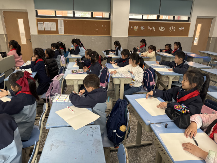 This image captures an indoor classroom scene in Longta, China, featuring approximately 20-25 elementary school-aged children. The students are seated at individual light blue desks with attached chairs, arranged in rows. Each child has white paper and an assortment of colored markers on their desk, actively engaged in a drawing or coloring activity. Many students wear a school uniform consisting of a dark blue jacket, light blue shirt, and a red neckerchief. Backpacks are visible hanging from chairs or placed next to desks. The classroom features light-colored walls, large windows along the upper section of the far wall providing natural light, and a corkboard strip displaying various papers. A light brown door is present on the left side of the room. The children are primarily focused on their individual creative tasks.
