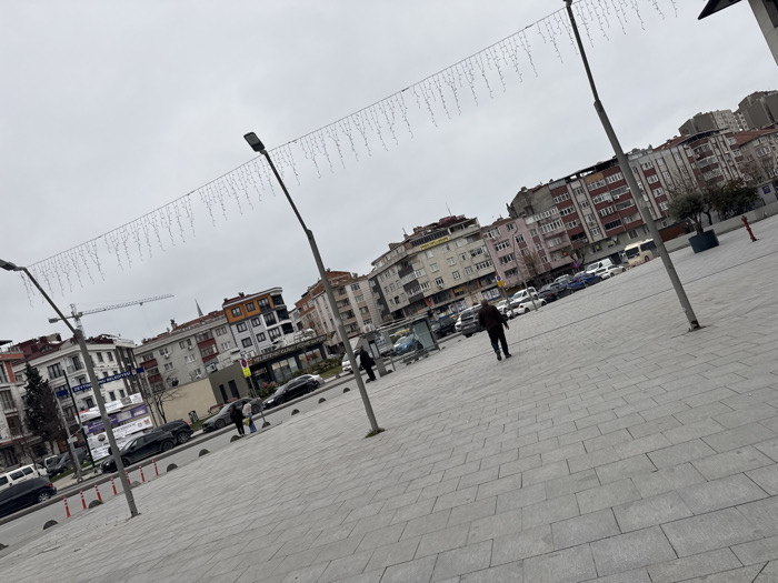 An urban scene under a cloudy sky features a wide, tiled plaza. Buildings of varying heights and architectural styles line the background, with cars parked along the streets. Streetlights with decorative string lights stretch overhead. A few people are walking around the plaza, adding a sense of everyday life to the scene. The photo is taken from a slightly low angle, emphasizing the expanse of the plaza.