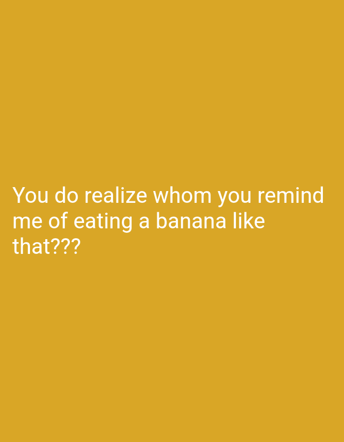 A solid mustard-yellow background displays white text centered horizontally. The text reads, "You do realize whom you remind me of eating a banana like that???" The phrase is conversational, almost accusatory, suggesting the manner of banana consumption is notable or humorous. The text's tone is inquisitive, ending with three question marks, implying a playful or suggestive remark.