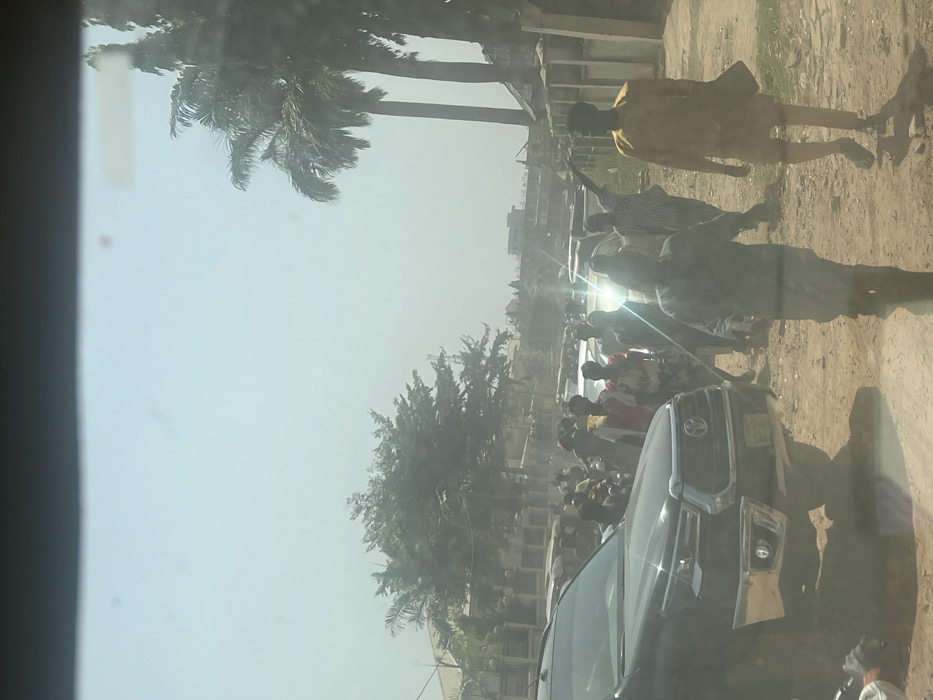 The image captures a busy daytime street scene in Abuja, Nigeria, viewed from within a vehicle. The environment is hazy and brightly lit. In the left foreground, a dark-colored Toyota Hilux pickup truck is positioned, its front bumper, grille, and headlights visible. A license plate is affixed to the front. The immediate road surface is unpaved, appearing dusty. The mid-ground features a concentration of approximately 15-20 pedestrians intermingling with vehicles that are either parked or moving slowly. Individuals are dressed in various casual and traditional Nigerian garments. One male pedestrian, located in the mid-right, is seen with his right arm raised and extended, pointing towards the right. Another male pedestrian in the immediate right foreground wears a yellow tunic and dark sandals, walking towards the left. Several other vehicles, including cars, are visible further back, some with bright sun glare. The background consists of residential or commercial buildings partially obscured by dense foliage. Tall palm trees are prominent on the far right, alongside a concrete wall or fence. A large, leafy tree is visible on the left side. The sky is a pale, hazy blue.