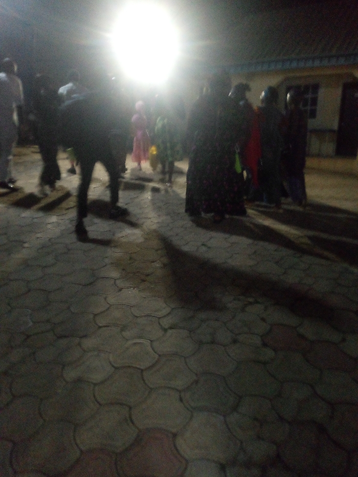 At night, a group of people stands under a bright light, their figures partially obscured by shadows. The ground is paved with interlocking geometric stones. A building is visible in the background, with at least one window. The people appear to be in casual or traditional attire, some wearing long dresses. The scene is brightly illuminated, casting strong shadows on the patterned ground.