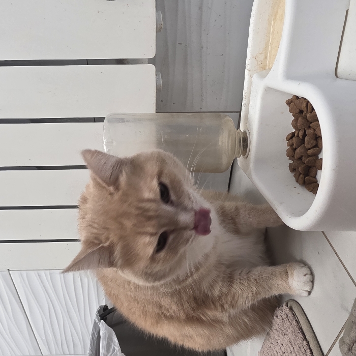 - "An orange domestic cat is captured indoors, reportedly in Foki, Russia, actively licking its lips with its pink tongue extended" by FM-RgtV62, licensed under CC BY 4.0