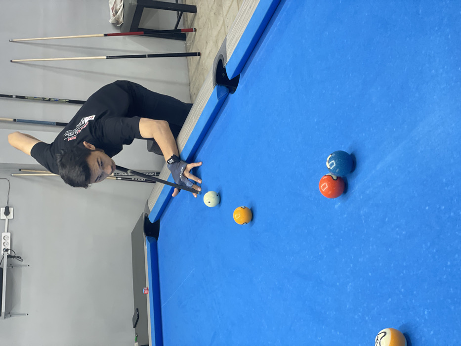 The scene depicts an indoor billiard hall in Lhokseumawe, Indonesia