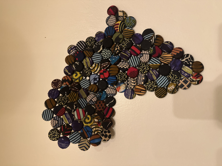 An arrow-shaped wall decoration is composed of numerous fabric-covered buttons