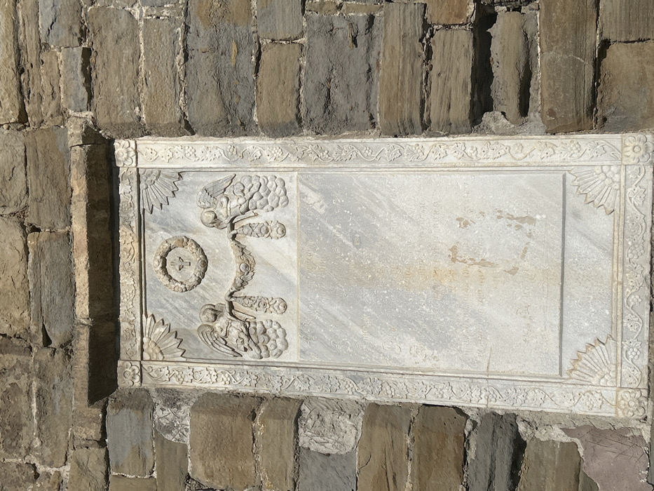 - "A rectangular white marble funerary plaque is deeply set into a rough-hewn, dark grey and brown stone wall" by FM-51spx1, licensed under CC BY 4.0