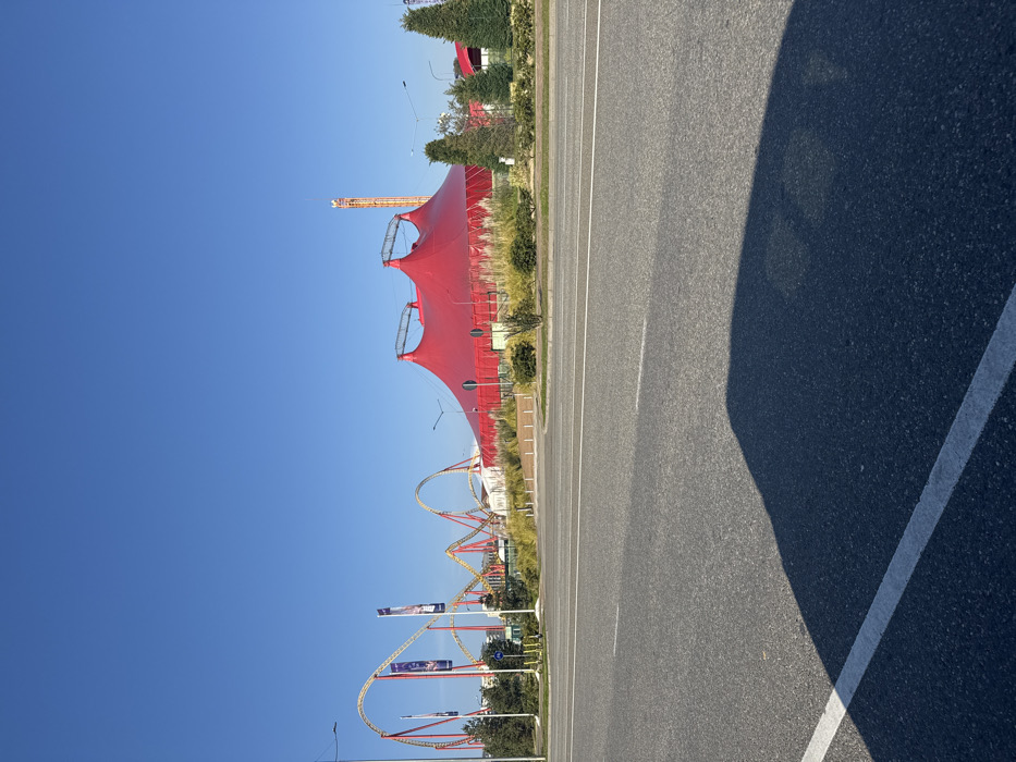 An outdoor, wide-angle photograph taken during clear daylight hours depicts an amusement park area adjacent to a paved roadway in Sirius, Sochi, Russia. The foreground consists of a multi-lane asphalt road with a partial white line visible on the far left. A large, dark shadow, likely cast by the photographer's vehicle, occupies the lower right quadrant of the road. In the midground, a prominent, multi-peaked red tent structure, characteristic of a large event or performance venue, is situated on the right side of the frame. To its left, a large yellow and red roller coaster track with multiple inversions and loops extends across the left-midground. A tall, slender yellow and red tower, possibly an amusement ride like a drop tower, is visible behind and to the right of the red tent. Various landscaping elements, including green shrubs, small coniferous trees, and tall dry grasses, separate the roadway from the park structures. Streetlights and flagpoles with banners are also present near the roller coaster tracks. The background features a clear, cloudless blue sky. No individuals or discernible actions are visible in the scene.