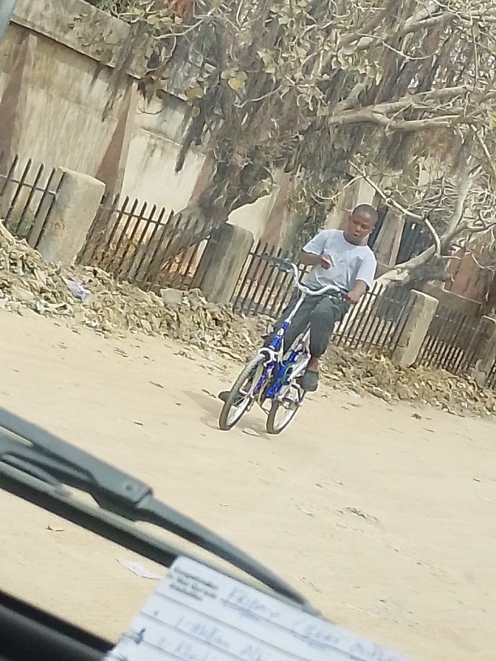 The scene depicts a young male riding a bicycle on an unpaved road in Hotoro South, Nigeria
