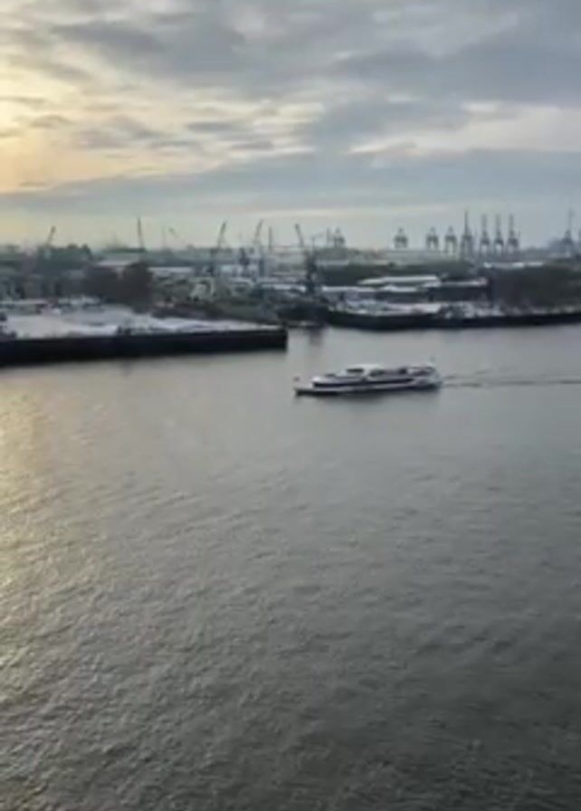 view of a harbor with several cranes in the background, a small black barge on the left and a river with a passenger ferry in the middle of the shot