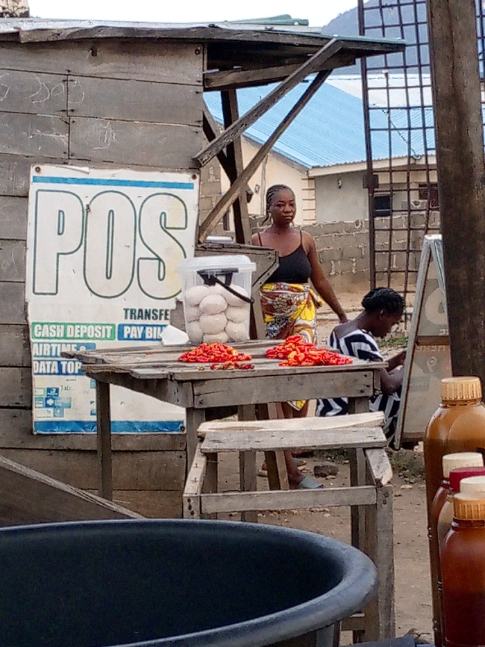 This image depicts an outdoor market scene in Adankolo, Nigeria. In the foreground, a dark-colored plastic tub is partially visible at the bottom left. The mid-ground features a rustic wooden stall constructed from horizontal planks. A white sign with large green letters spells "POS," accompanied by smaller text indicating "TRANSFER," "CASH DEPOSIT," "PAY BILL," "AIRTIME & DATA TOP." In front of the stall is a wooden table. On this table, a clear plastic container with a black lid holds several light-colored, spherical food items. To its right, two distinct piles of small, red-orange chili peppers are present. An adult female stands behind the table, positioned slightly to the right of the clear container. She has dark skin, braided hair, and wears a black spaghetti-strap top and a multicolored patterned wrapper. She looks directly towards the viewer with a neutral expression. Further to the right and slightly behind, a second adult female with dark skin and braided hair is seated, mostly facing away from the viewer. She wears a black and white striped long-sleeved garment and appears to be engaged in an activity on a lower surface. On the far right, several brown plastic bottles with yellow caps are visible. The background shows a metal grid structure and partially constructed buildings with unpainted concrete block walls and light blue corrugated metal roofs. The ground is unpaved dirt.