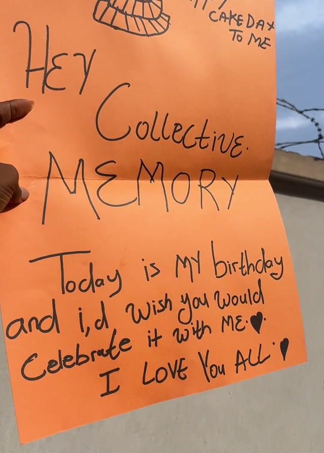 A person holds an open, orange-colored sign with a message written on it. The message reads, "+1 today. HAPPY CAKE DAY TO ME. Hey Collective Memory. Today is my birthday and I'd wish you would celebrate it with ME. I LOVE You ALL." The message is handwritten in black marker, and a simple drawing of a cake with a candle is at the top right. A dark-skinned hand with manicured nails is visible in the bottom left corner, pointing at the word "Hey". The background consists of a clear sky, foliage, a building, and what appears to be barbed wire. The sign is held up outside, suggesting the person is celebrating their birthday or "cake day."